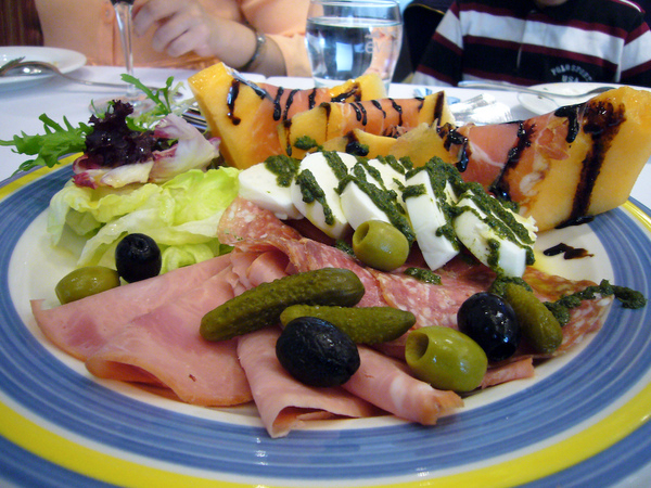 義式冷肉拼盤..右上是火腿鋪在哈密瓜上再淋上紅酒醋, 下來是青醬配乳酪, Salami, 火腿切片...最特別是最上面那個..特別的組合, 吃過才知道的好滋味...
