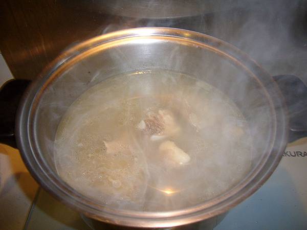 1. 把湯排洗淨放入約一大碗公的水裡一起熬煮...