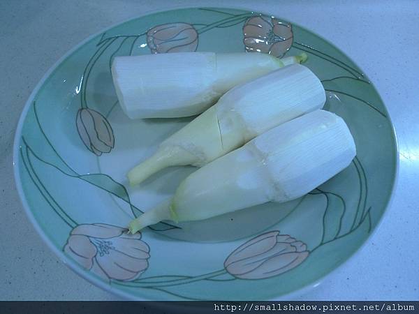 1. 皎白筍洗淨, 連殼放入盤中, 微波一分鐘