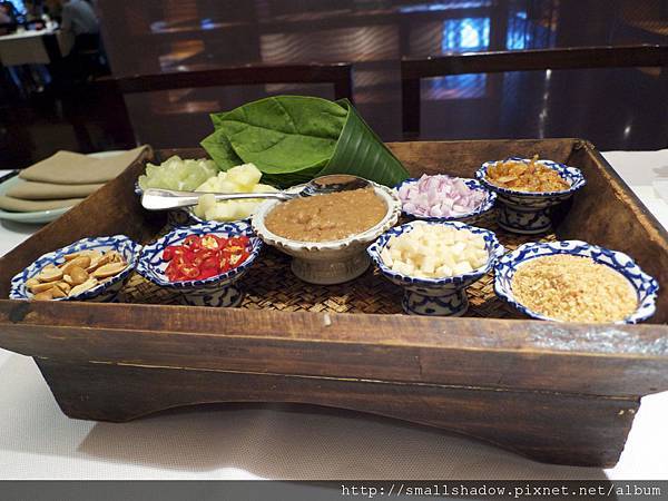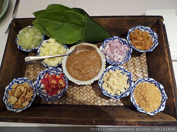 吃法咧...就是拿一葉上方的波菜葉, 先塗上中間的泰式甜麵醬,