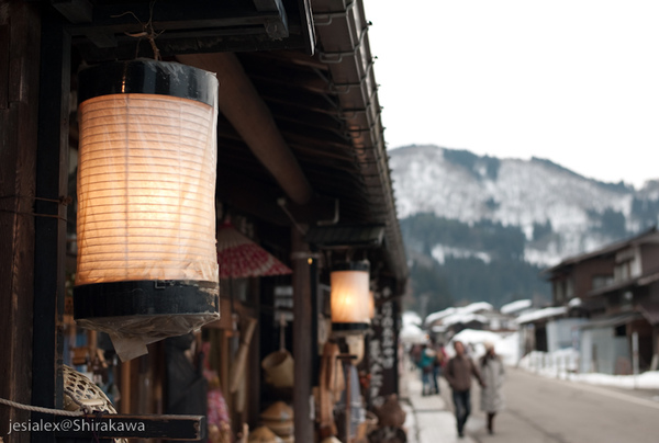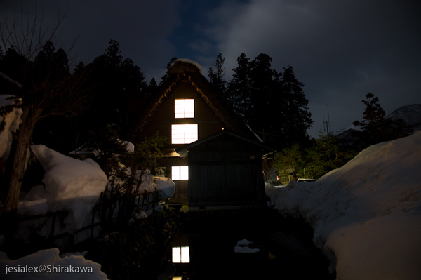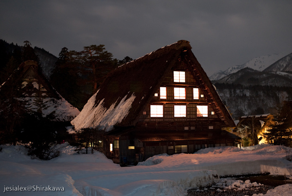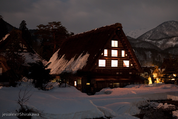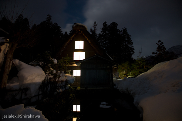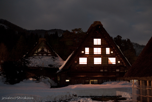 (合掌村每年ㄧ二月的時候就會選定幾個星期六為點燈日, 當晚所有合掌屋的燈都會點亮, 是攝影迷來朝聖的大日子)