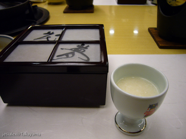 一入座, 桌上就擺好了這食盒跟一小杯清酒...
