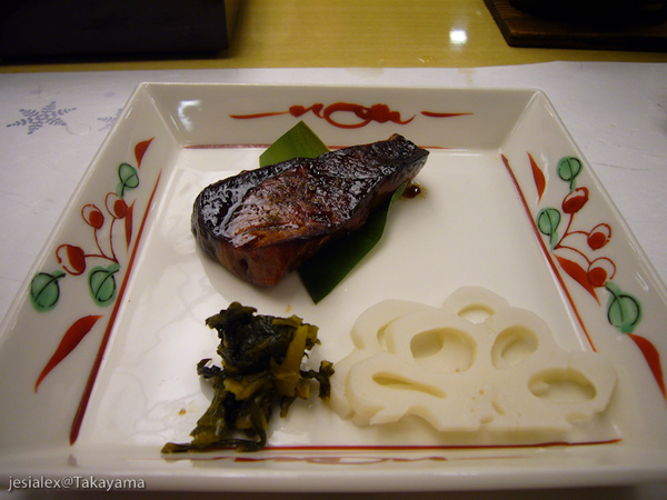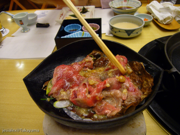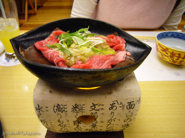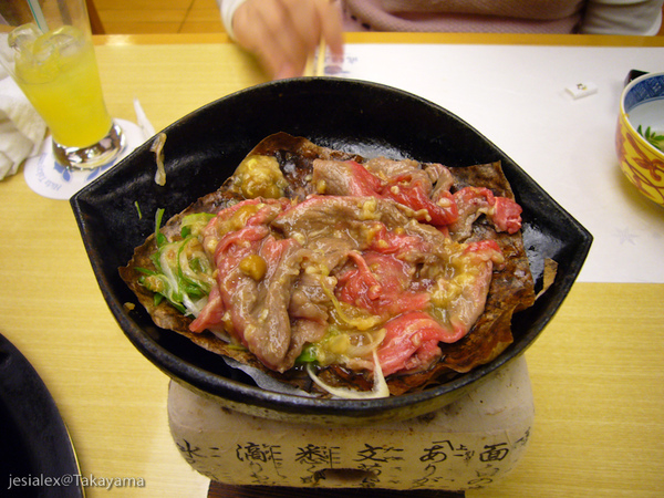 再來主角還是沒出來, 不過倒是見著了飛驒牛...這是朴葉味增燒牛肉, 墊在牛肉下面的就是朴葉...