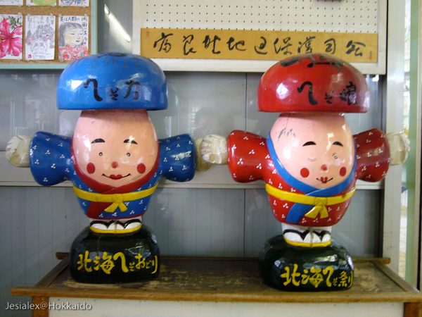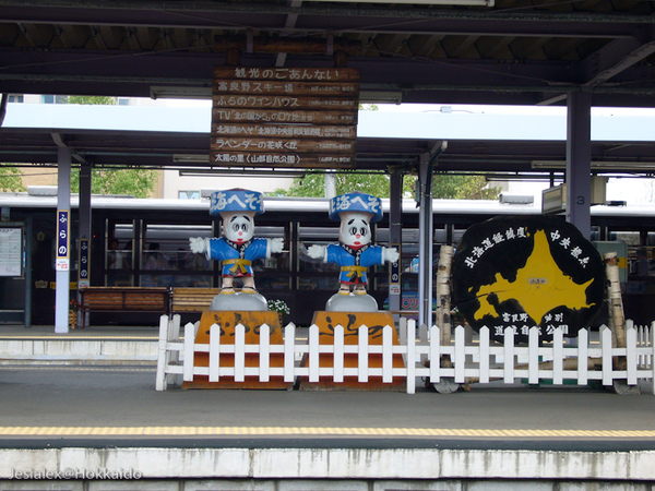 從新得搭小火車來到富良野, 一下車就看到這兩個公仔站在北海道的中央點歡迎我們~